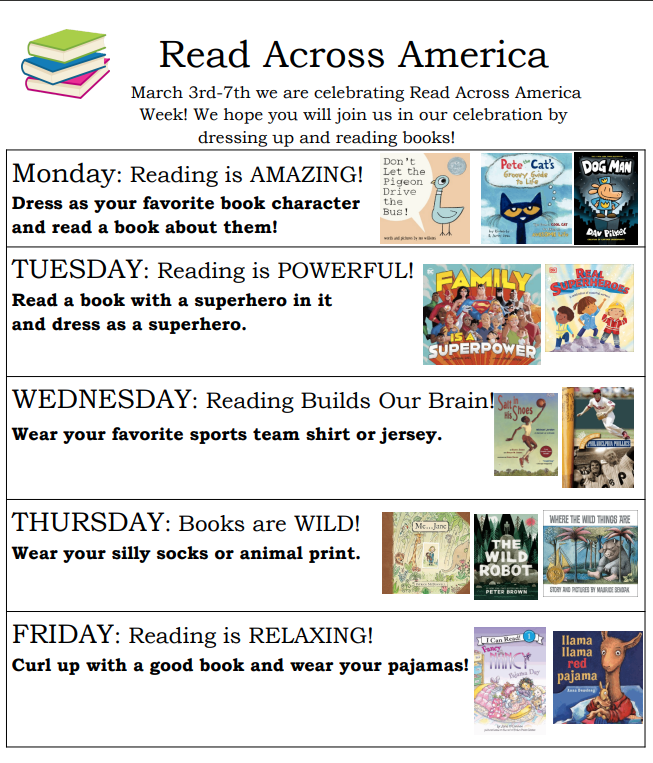 Join us for these special dress down days next week as we celebrate Read Across America Week! It is about more than just reading—it’s about creating a lifelong passion for learning, igniting imagination, and building empathy and understanding through stories. So grab a book, turn the pages, and join the fun! 🌟