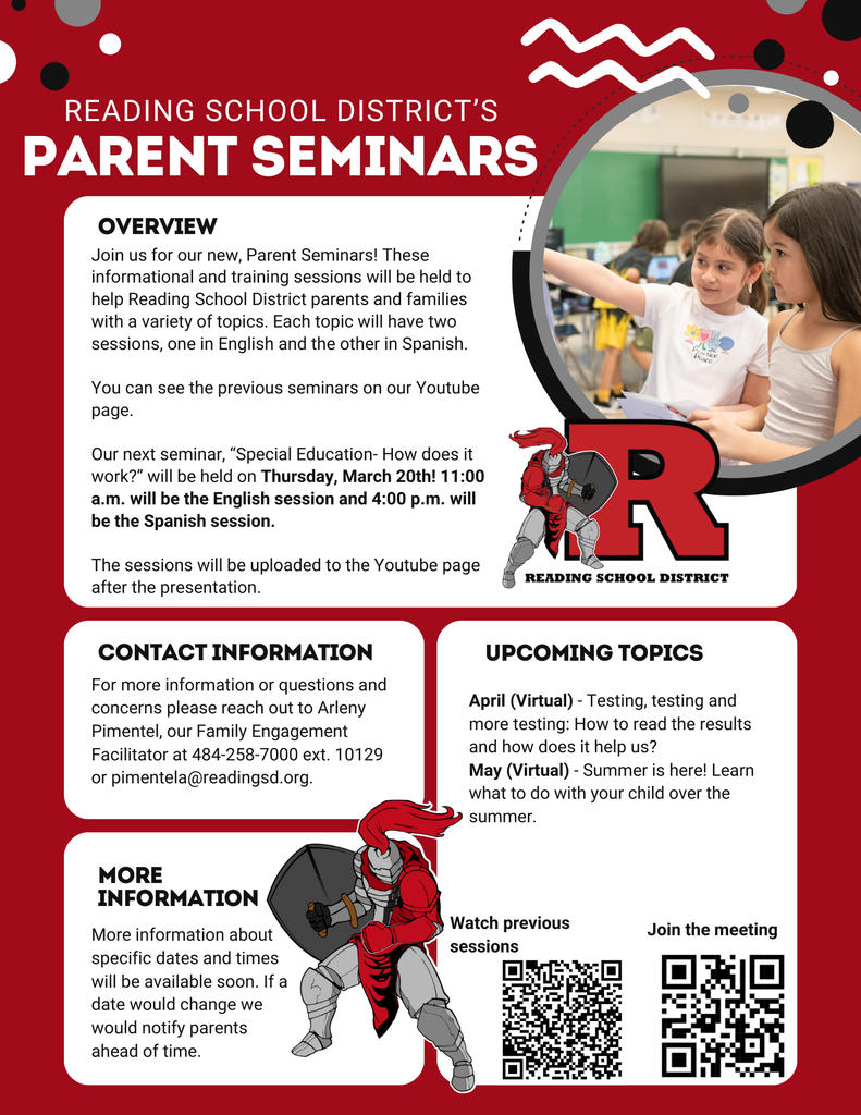 En nombre de la Junta Directiva del Distrito Escolar de Reading, les deseamos a todos un año escolar 2025-2026 seguro, exitoso e inspirador. ¡Hagamos que sea el mejor hasta ahora! ¡Una vez eres un Caballero Rojo, siempre serás un Caballero Rojo!